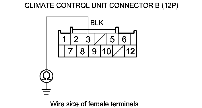 7. Check for continuity between climate control unit connector B (12P) terminal No. 3 and body ground.