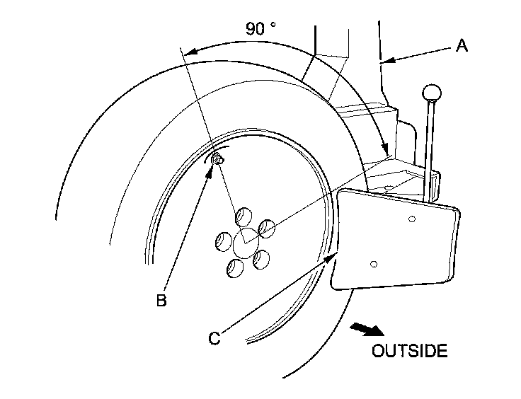 - Position the wheel as shown so the valve stem (B) is 90 degrees from the bead breaker (C) as shown.