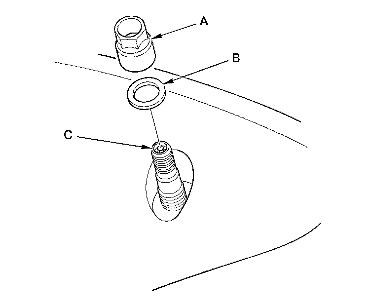 6. Remove the valve stem nut (A) and the washer (B), then remove the tire pressure sensor with the valve stem (C) from the wheel.