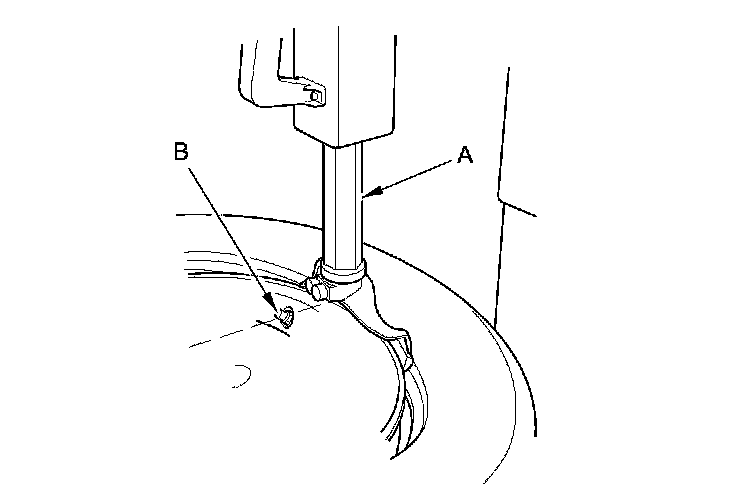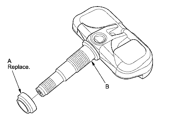 7. Remove and discard the valve stem grommet (A) from the tire pressure sensor (B).