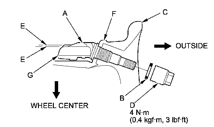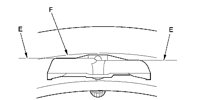 NOTE: Install the tire pressure sensor so that the sensor housing surface (E) is below the protrusion (F) of the wheel to prevent the sensor housing from being caught on the bead of the tire when installing the tire. Be sure to always mount the tire pressure sensor with its feet (G) in the downward position toward the wheel.