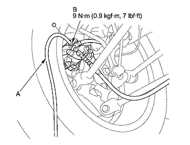 4. Attach a length of clear drain tube (A) to the bleed screw (B), then loosen the bleed screw to allow air to escape from the system. Then tighten the bleed screw securely.
