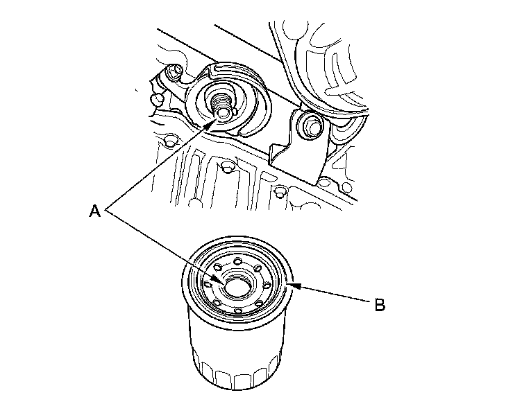 4. Inspect the threads (A) and the rubber seal (B) on the new filter. Clean the seat on the oil filter base, then apply a light coat of new engine oil to the oil filter rubber seal. Use only filters with a built-in bypass system.