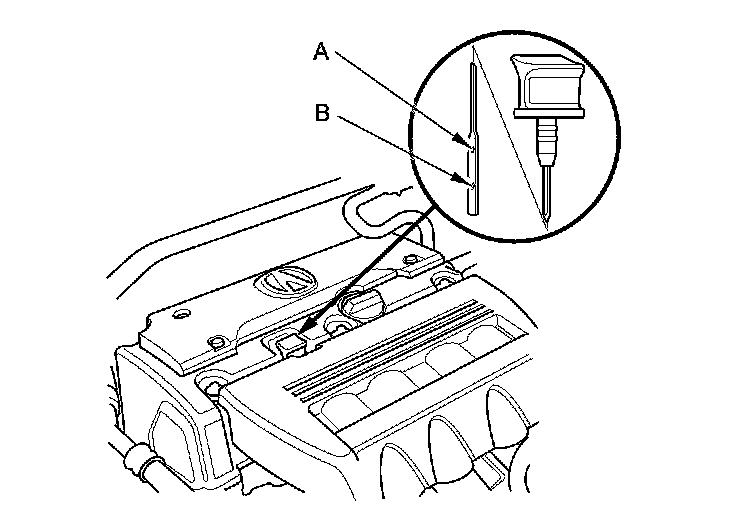 3. Remove the dipstick, and check the engine oil level. It should be between the upper mark (A) and the lower mark (B).
