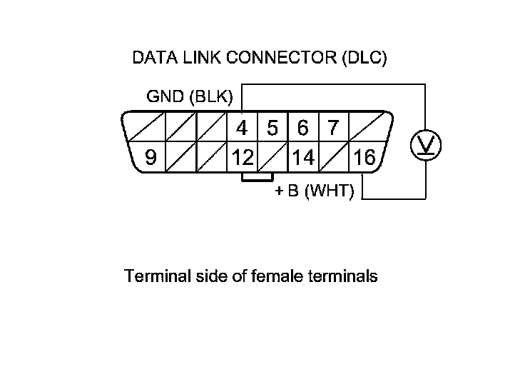 27. Measure the voltage between DLC terminals No. 4 and No. 16.