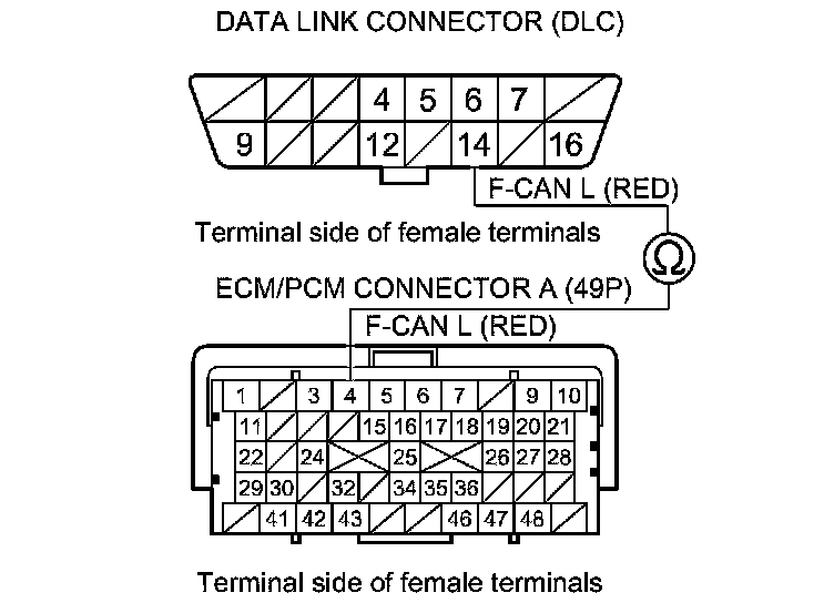 33. Check for continuity between ECM/PCM connector terminal A4 and DLC terminal No. 14.