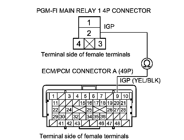 48. Check for continuity between PGM-FI main relay 2 4P connector terminal No. 2 and body ground.