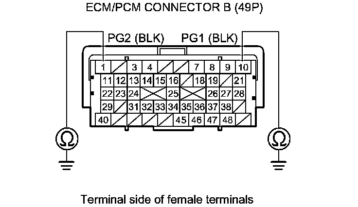 71. Check for continuity between body ground and ECM/PCM connector terminals B1, B10, C2, C44, and C48 individually.