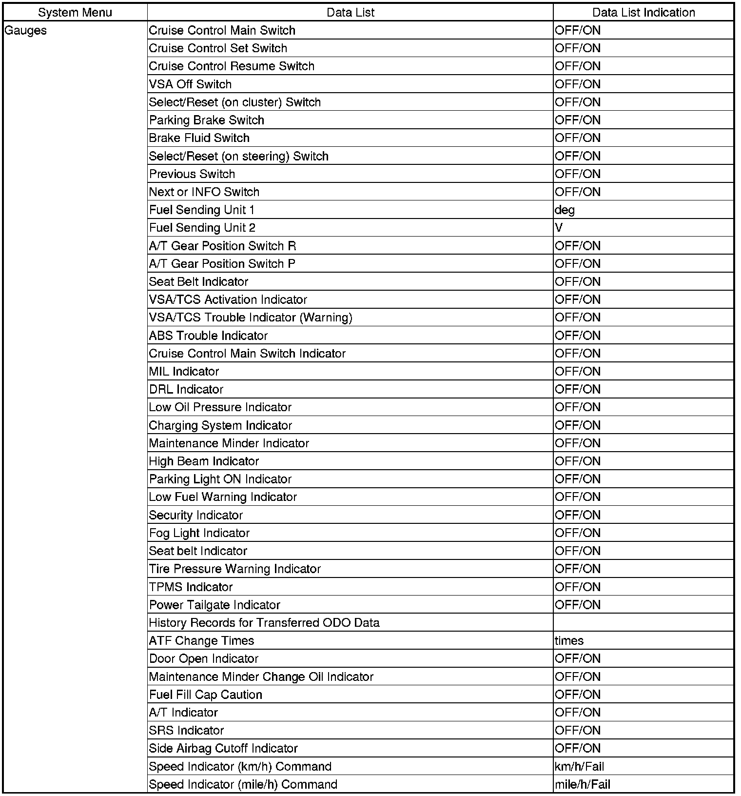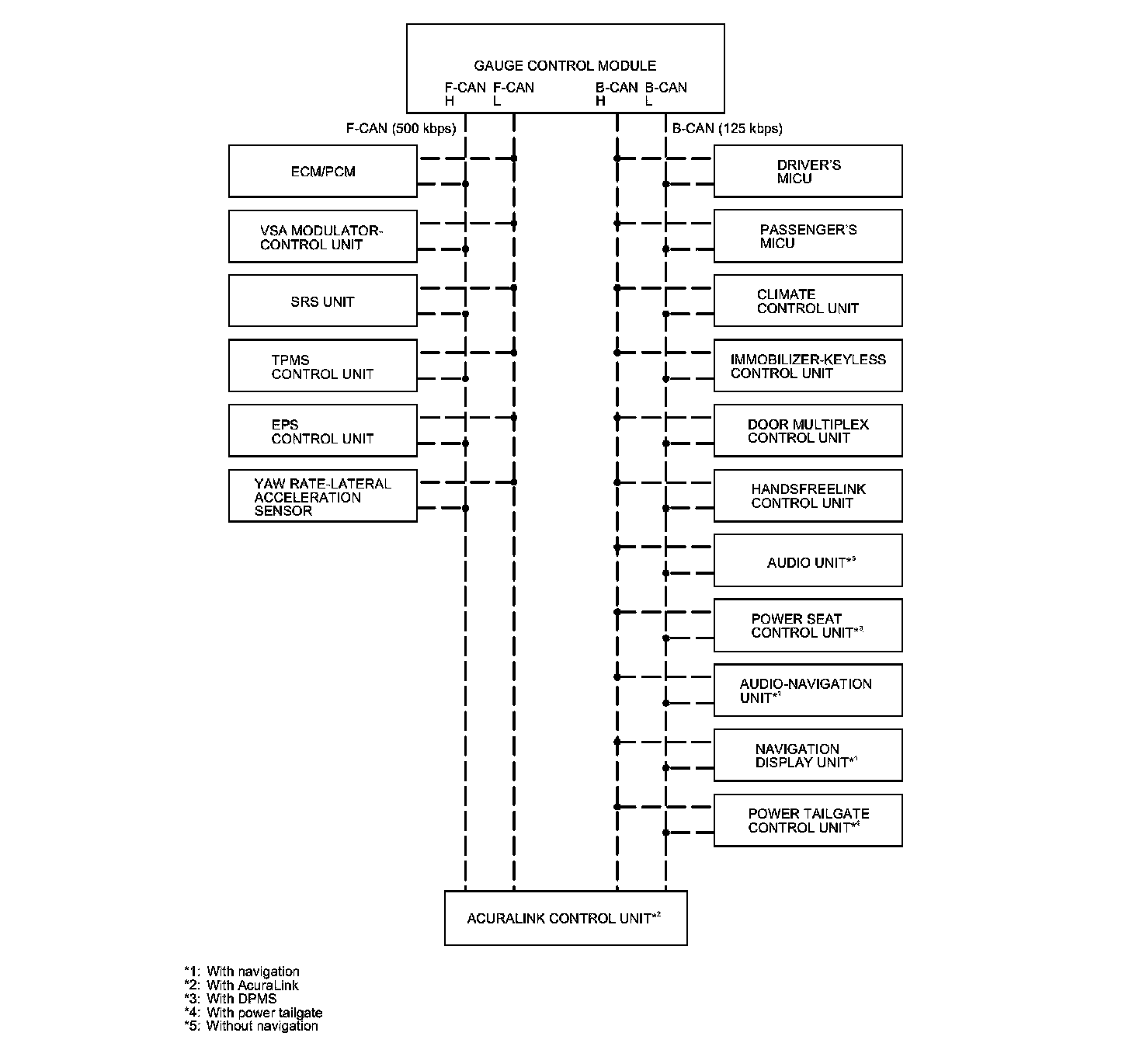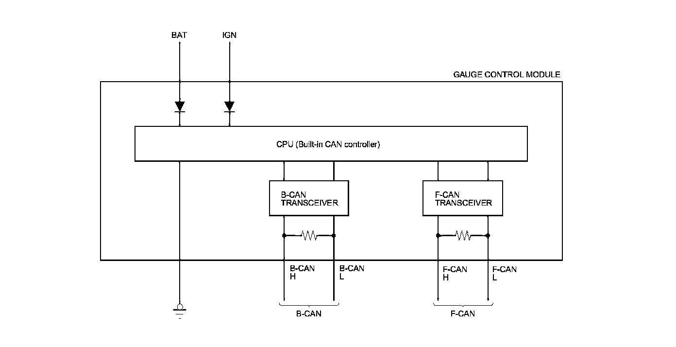 The body controller area network (B-CAN) and the fast controller area network (F-CAN) share information between multiple electronic control units (ECUs). B-CAN communication moves at a slower speed (125 kbps) for convenience related items and for other functions. F-CAN information moves at a faster speed (500 kbps) for "real time" functions such as fuel and emissions data. To allow both systems to share information, the gauge control module translates and relays the information from B-CAN to F-CAN and from F-CAN to B-CAN. This is called the Gateway Function.