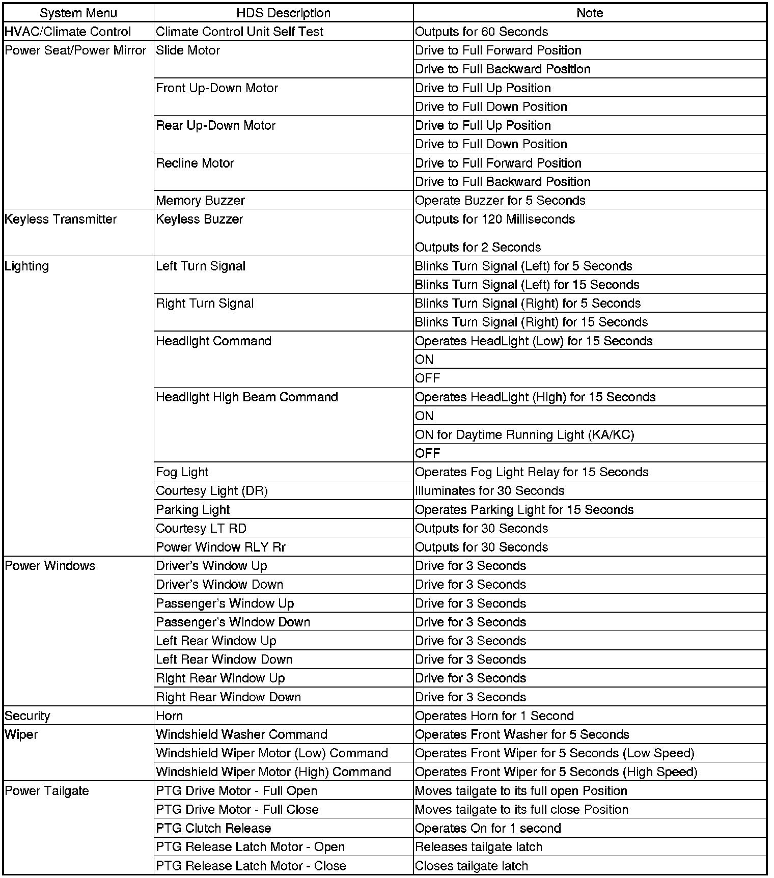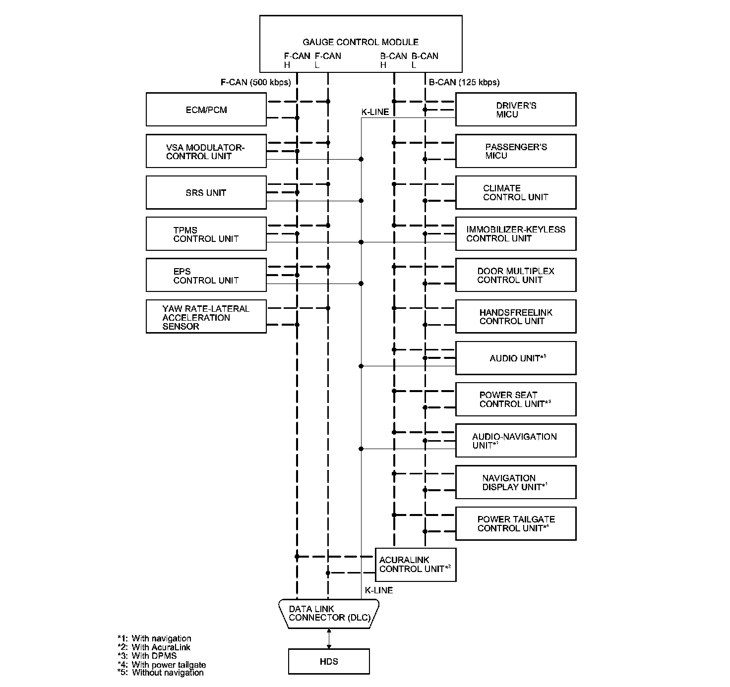 By connecting the HDS to the data link connector (DLC), the HDS can retrieve the diagnostic information from the driver's MICU via a diagnostic line called the K-LINE. The K-LINE is a separate communication line from the CAN lines, but it is connected to most of the CAN related ECUs. The driver's MICU is a gateway between the HDS and B-CAN related ECUs, and sends B-CAN diagnostic information to the HDS. When doing a function test with the HDS, the HDS sends an output signal through the K-LINE to the driver's MICU. The driver's MICU either relays the request to another ECU, or commands the function itself.