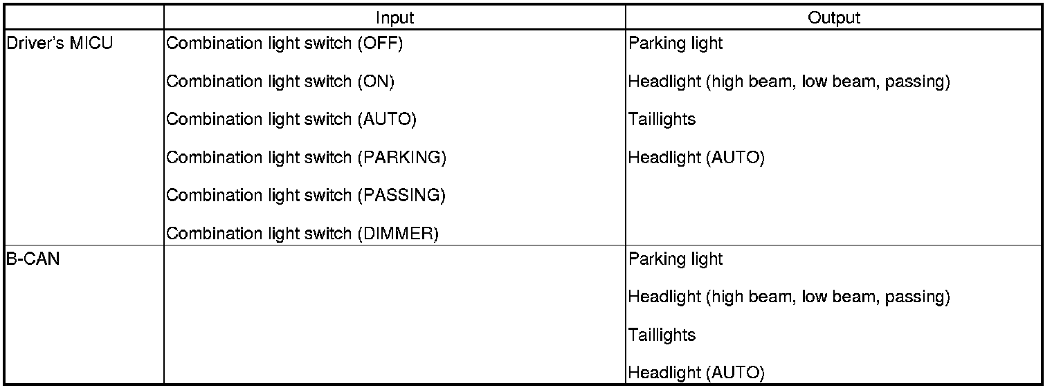 The driver's MICU control of the lighting system and horns is based on inputs from each switch and the B-CAN data.