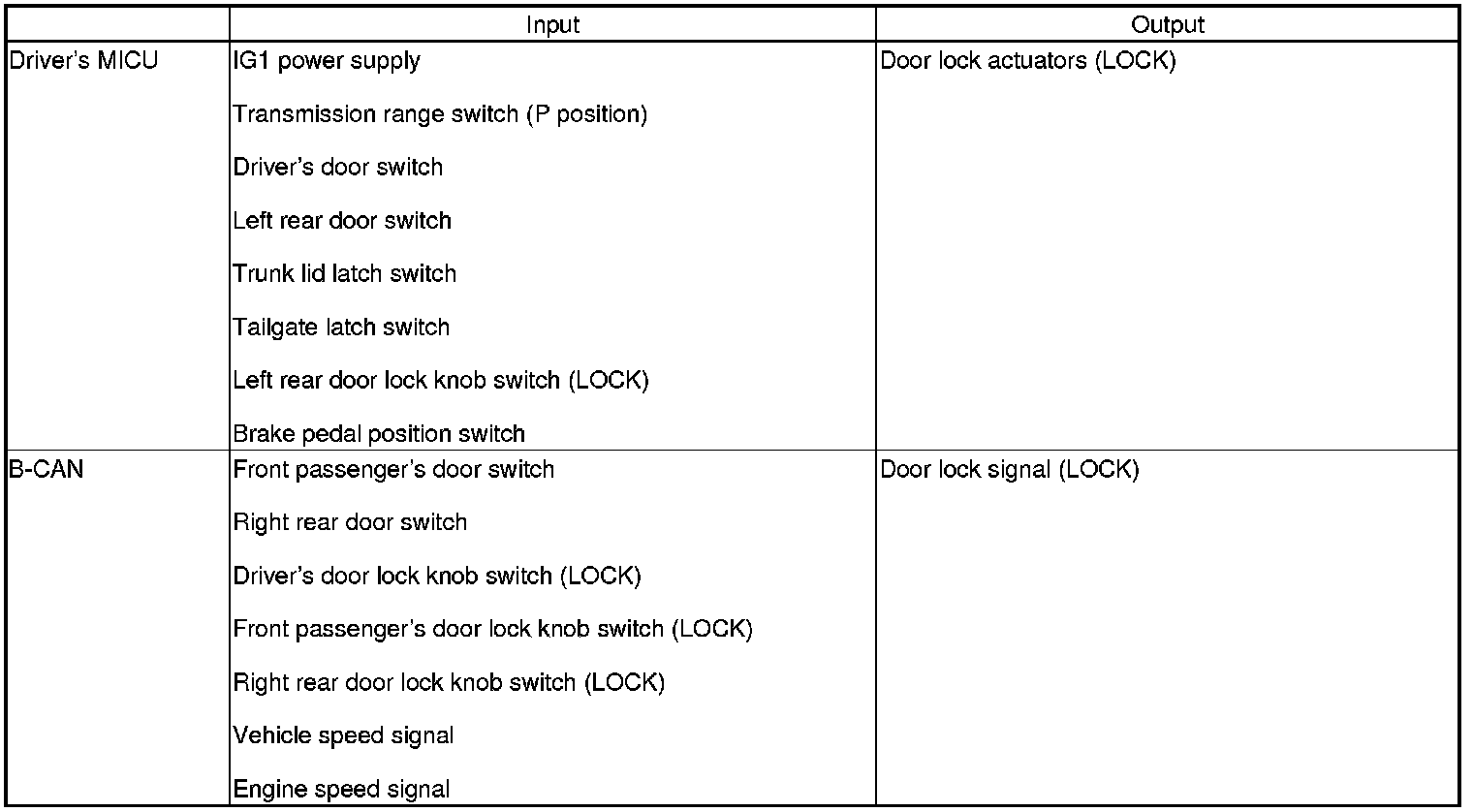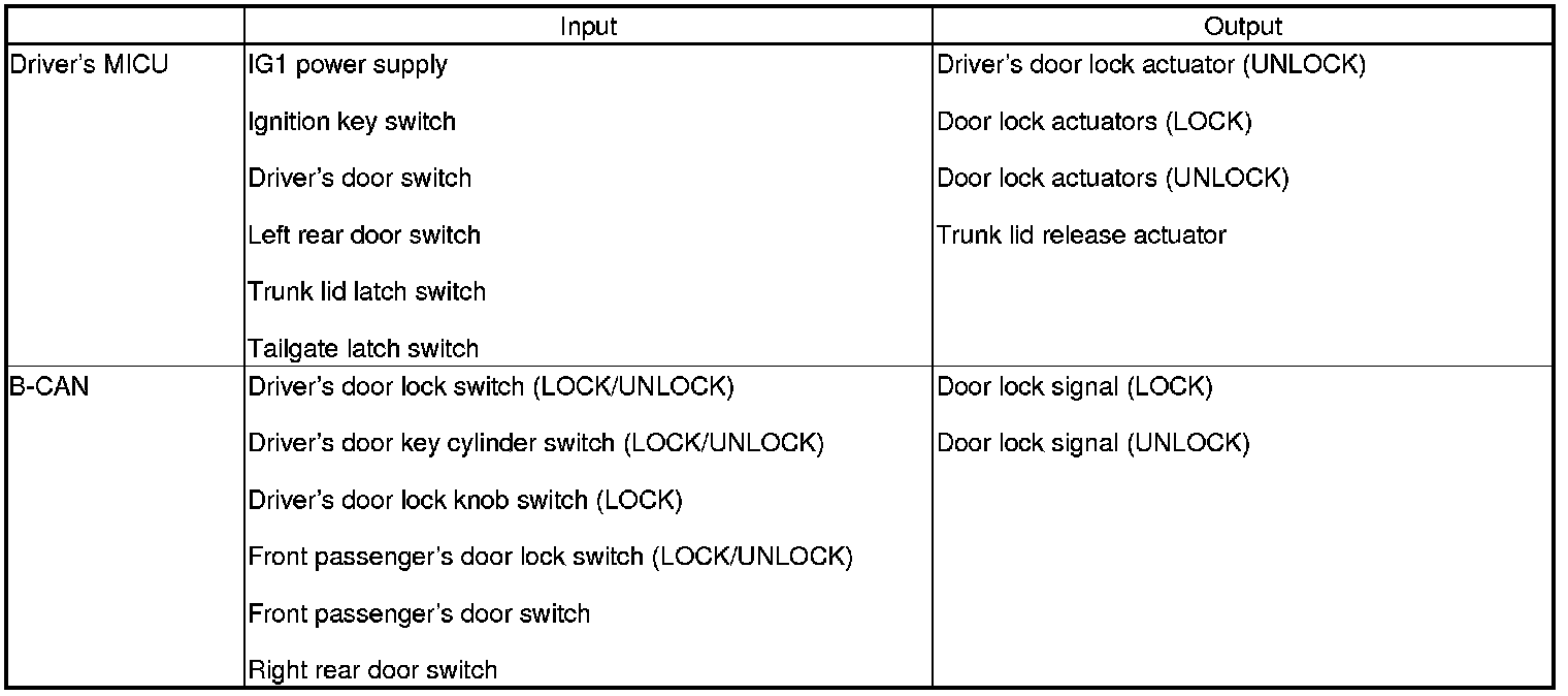The driver's MICU control of the door lock actuators LOCK, UNLOCK, DRIVER'S UNLOCK, TRUNK UNLOCK is based on the B-CAN door lock switch signals.