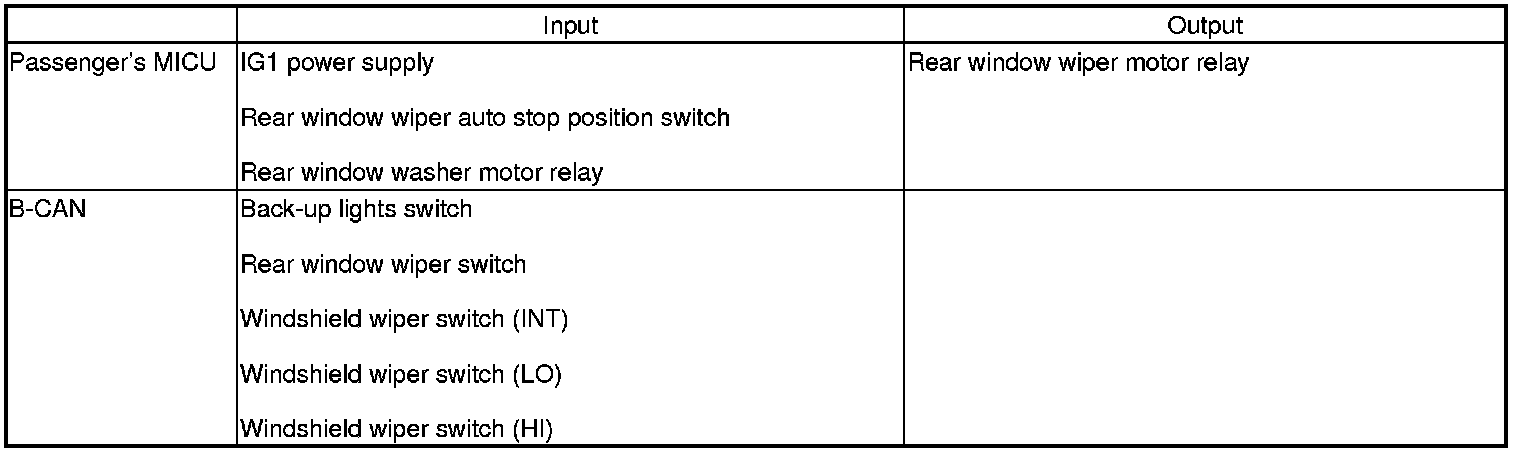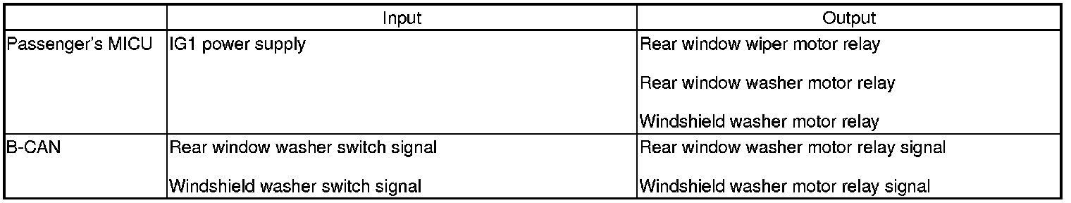 The passenger's MICU control of the rear window wiper motor and rear window washer motor is based on input signal from the wiper switch.