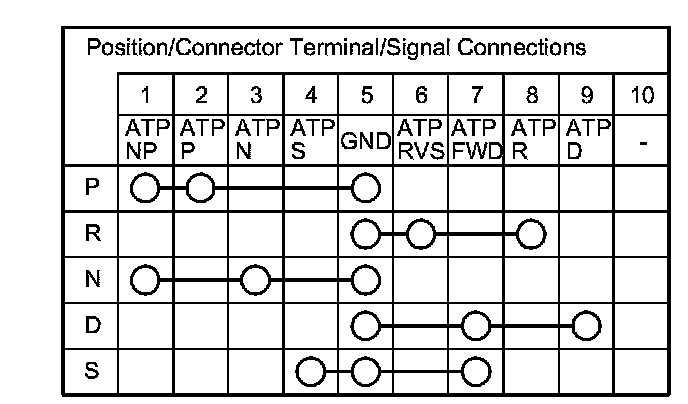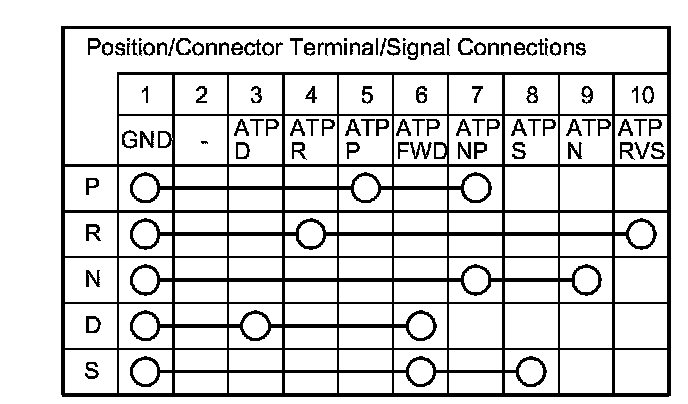 9. Check for continuity between the terminals at the transmission range switch connector. There should be continuity between the terminals in the following table for each shift lever position.