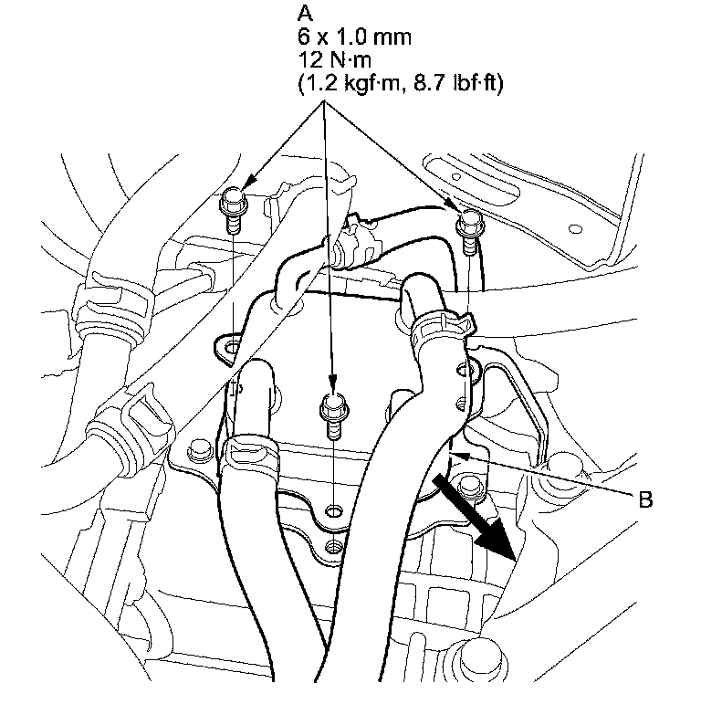 9. Remove the bolts (A) securing the ATF warmer (B), and move it out of the way.