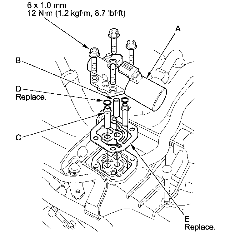 11. Remove the 8 x 35 mm ATF joint pipe (B), the 8 x 35.7 mm ATF pipes (C), the O-rings (D), and the gasket (E).