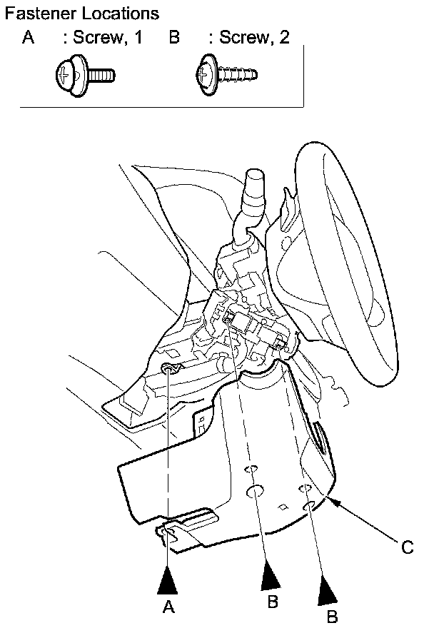6. Remove the screws (A, B), then remove the lower column cover (C).