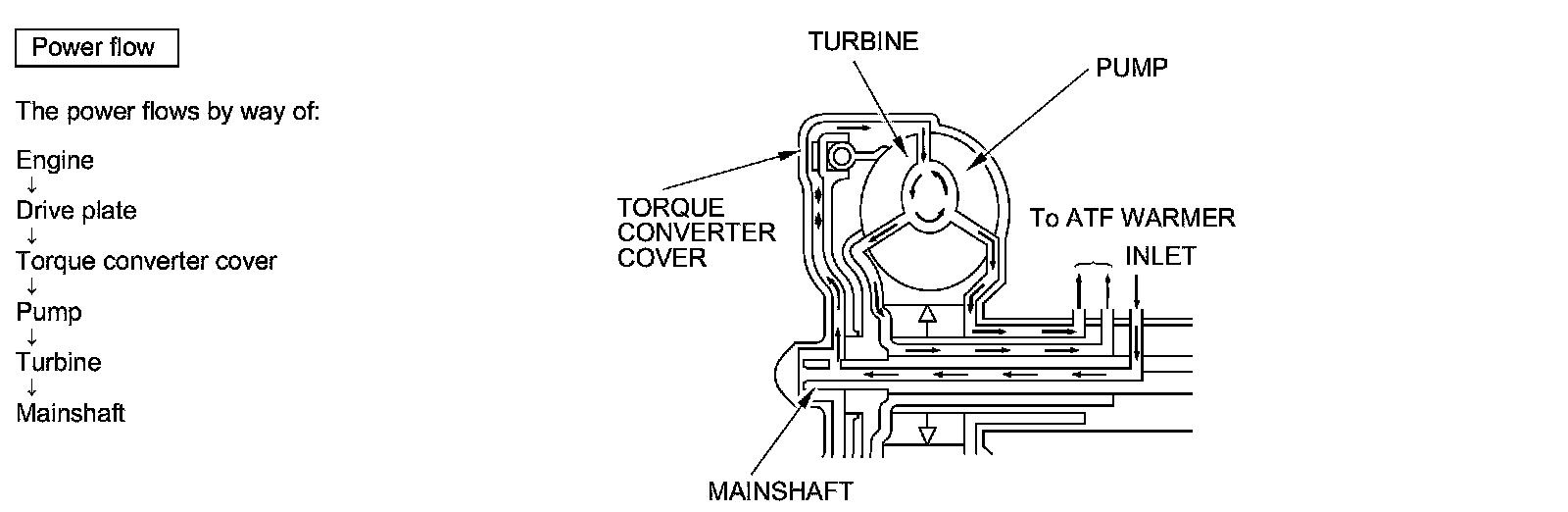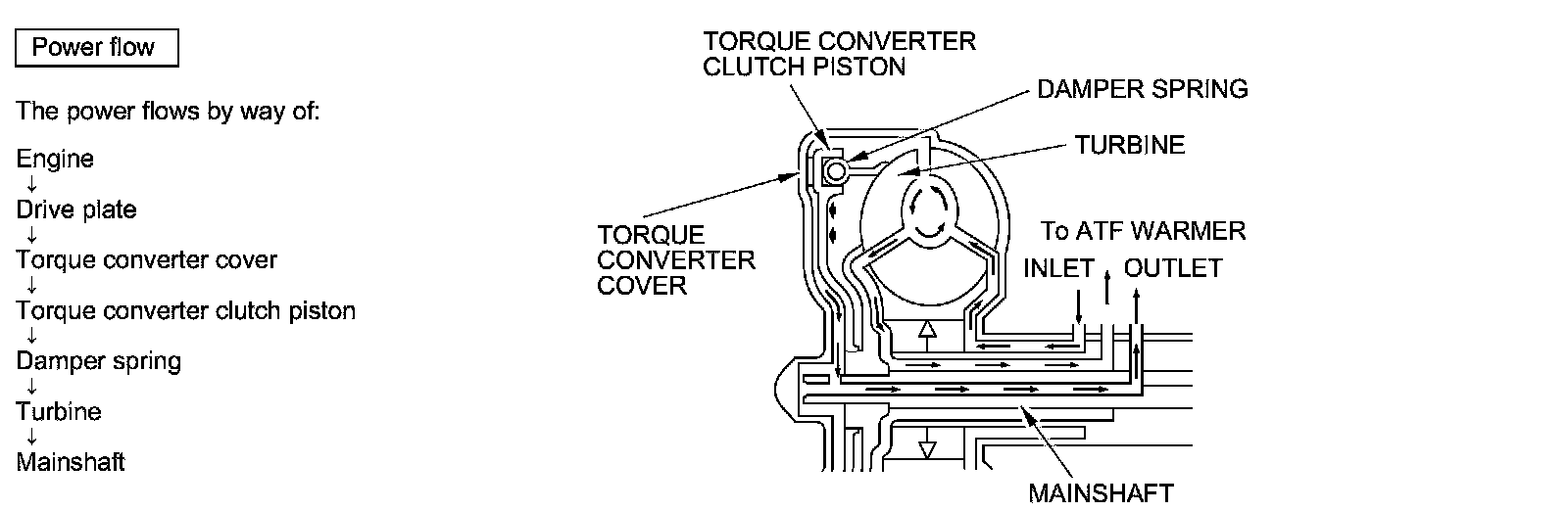 Fluid entered from the chamber between the torque converter cover and the torque converter clutch piston passes through the torque converter and goes out through the chambers between the turbine and the stator, and between the pump and the stator. As a result, the torque converter clutch piston moves away from the torque converter cover, and the torque converter clutch lock-up is released; the torque converter clutch lock-up OFF.