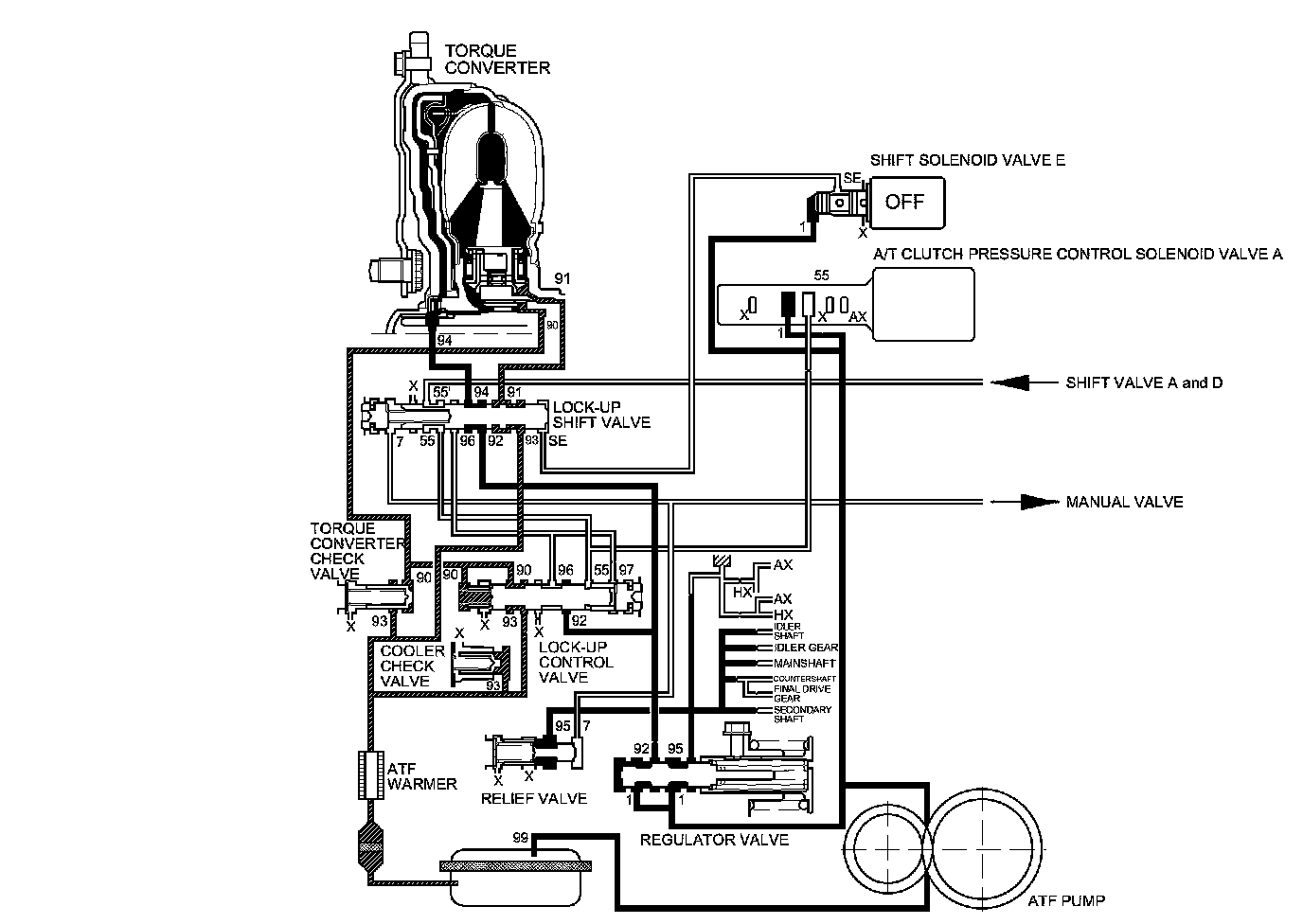 The PCM turns shift solenoid valve E OFF, and shift solenoid valve E pressure (SE) is not applied to the lock-up shift valve. The lock-up shift valve remains to the right to uncover the torque converter pressure ports leading to the left side of the torque converter and releasing pressure from the right side of the torque converter. Torque converter pressure (92) changes to (94) at the lock-up shift valve, and enters into the left side of the torque converter to disengage the torque converter clutch. This keeps the torque converter clutch piston keeps away from the torque converter cover and the torque converter clutch lock-up is OFF.