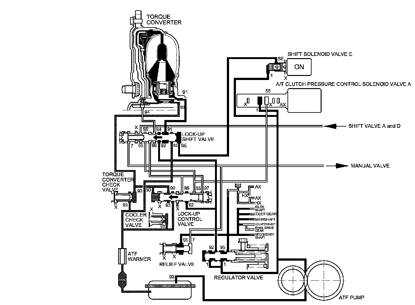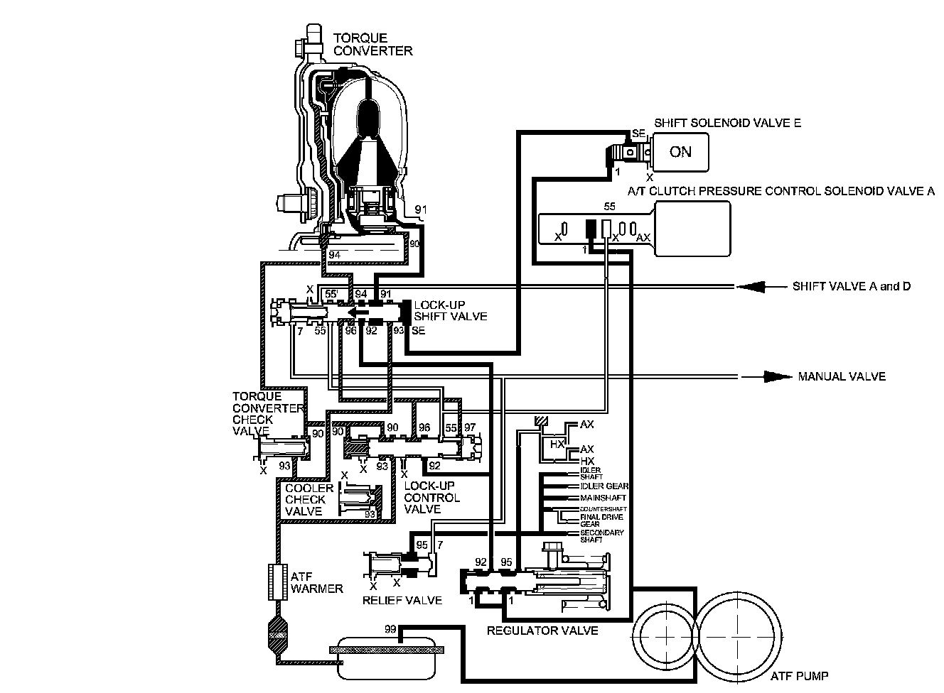 As the speed of the vehicle reaches the programmed value, the PCM turns shift solenoid valve E ON, and shift solenoid valve E pressure (SE) is applied to the right side of the lock-up shift valve. The lock-up shift valve is moved to the left side to switch the torque converter pressure port (91), which goes to the right side of the torque converter, and the torque converter pressure port (94) is released from the left side of the torque converter. Torque converter pressure (91) flows to the right side of the torque converter to engage the torque converter clutch. The PCM also controls A/T clutch pressure control solenoid valve A to regulate A/T clutch pressure control solenoid valve A pressure. A/T clutch pressure solenoid valve A (55) is applied to the lock-up shift valve and the lock-up control valve. The position of the lock-up control valve depends on A/T clutch pressure control solenoid valve A pressure (55) and torque converter pressure released from the torque converter. The lock-up control valve controls the amount of torque converter clutch lock-up until fluid between the clutch piston and the torque converter cover is fully released; the torque converter clutch is in partial lock-up.