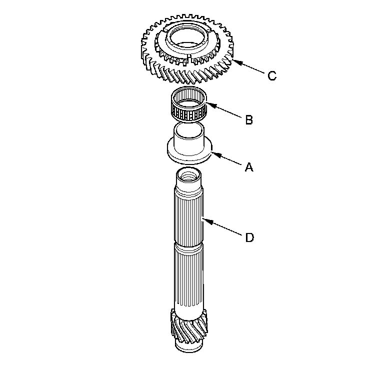 2. Install the 1st gear distance collar (A) with the needle bearing (B) and 1st gear (C) onto the countershaft (D).