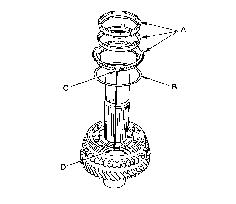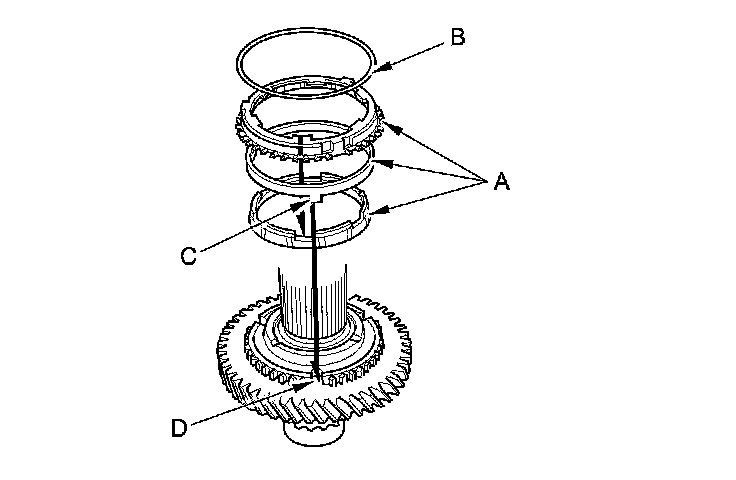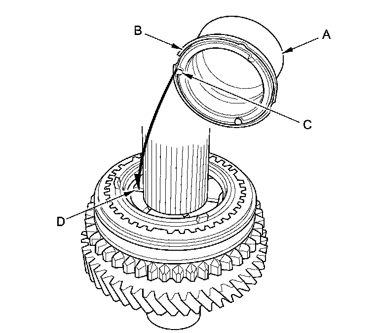 6. Install the triple cone synchro assembly (A) with the synchro spring (B) by aligning the synchro ring fingers (C) with the grooves (D) in the 1st/2nd synchro hub.