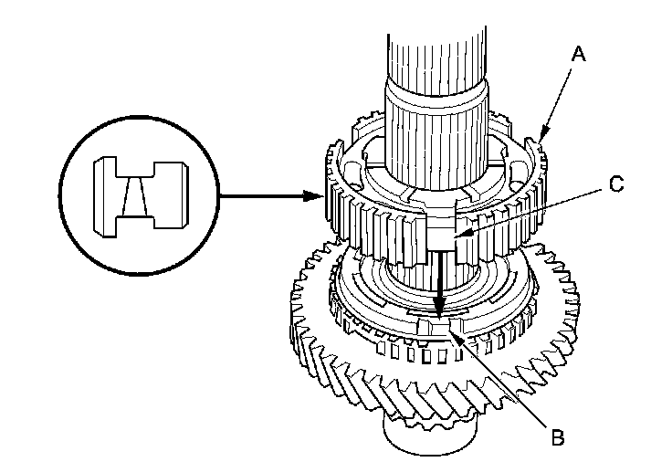 4. Install the 1st/2nd synchro hub (A) by aligning the synchro ring fingers (B) with the grooves (C) in the 1st/2nd synchro hub.