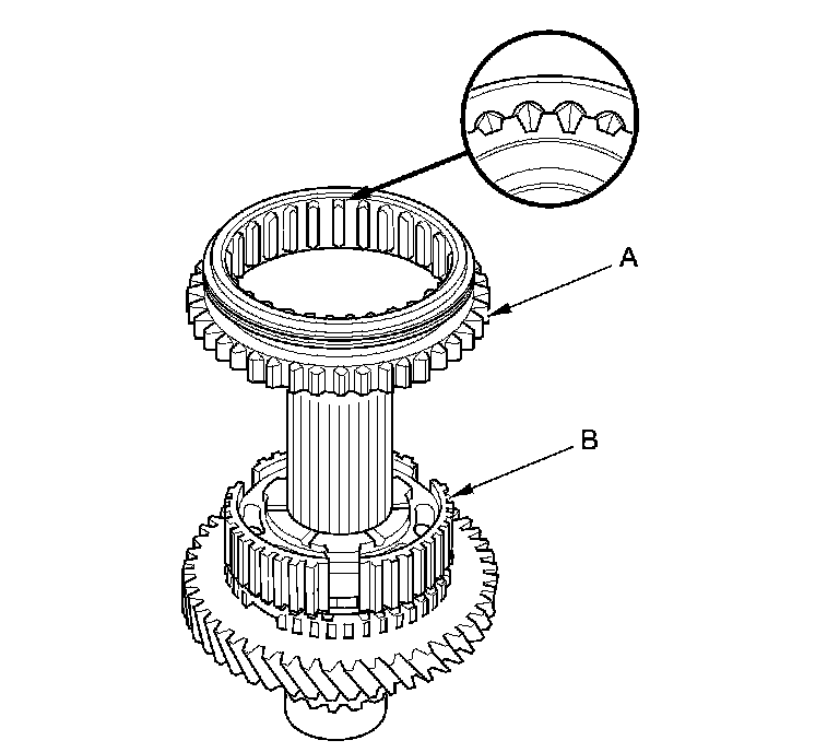 5. Install the reverse gear (A) by aligning the slots of the reverse gear and the 1st/2nd synchro hub (B). After installing, check the operation of the 1st/2nd synchro hub set.