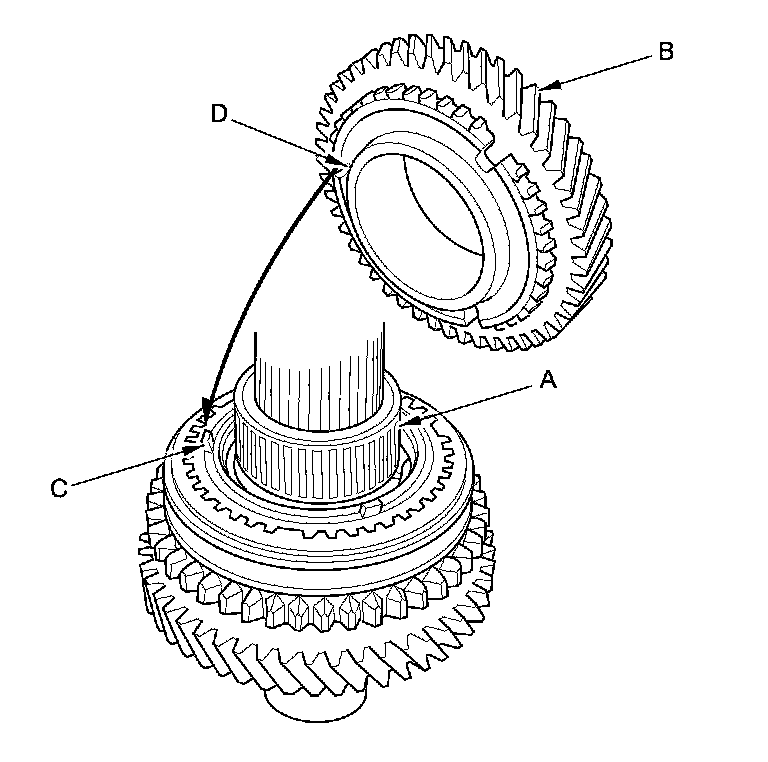 3. Install the triple cone synchro assembly (A) with the synchro spring (B) by aligning the synchro cone fingers (C) with the grooves (D) in 1st gear.