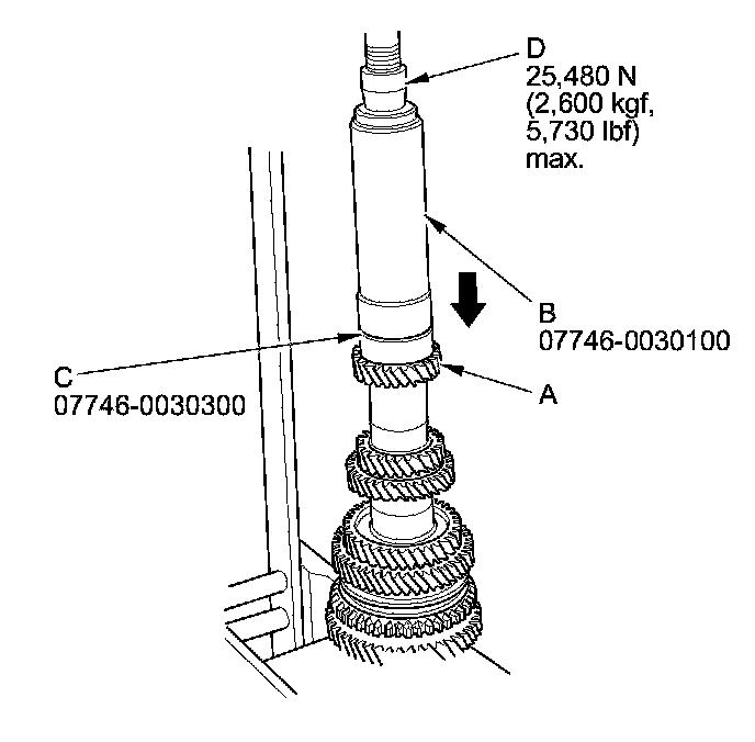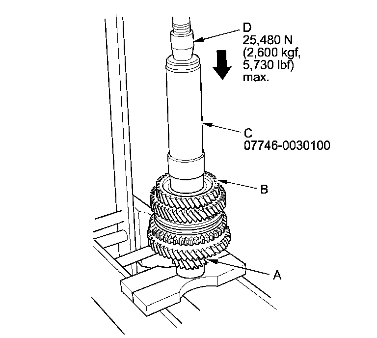 13. Press on 6th gear (A) using the 40 mm I.D. driver handle (B), the 30 mm I.D. bearing driver attachment (C), and a press (D).