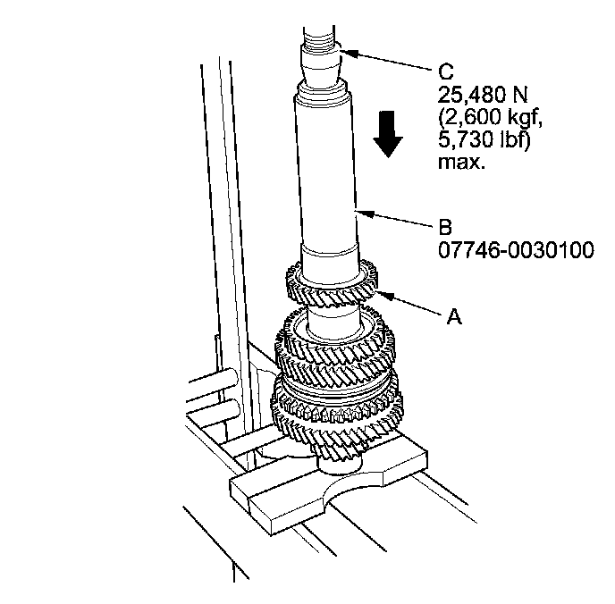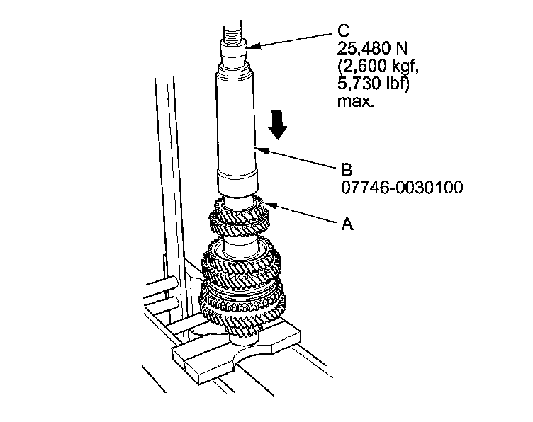 12. Press on 5th gear (A) using the 40 mm I.D. driver handle (B) and a press (C).
