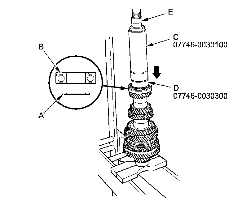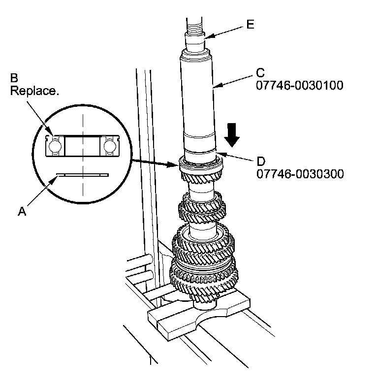 19. Install the correct 35 mm shim (A) and a new ball bearing (B) using the 40 mm I.D. driver handle (C), the 30 mm I.D. bearing driver attachment (D), and a press (E).
