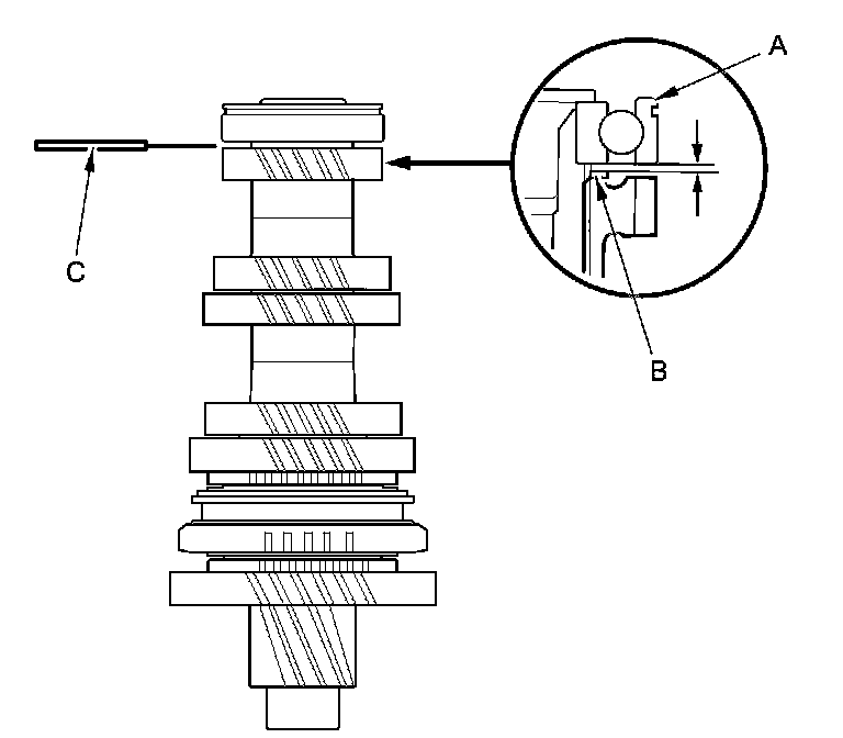 15. Measure the clearance between the ball bearing (A) and the 35 mm shim (B) with a feeler gauge (C).
