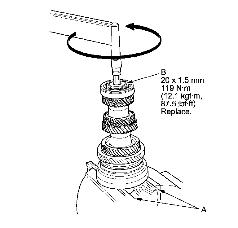 21. Securely clamp the countershaft assembly in a bench vise with wood blocks (A).