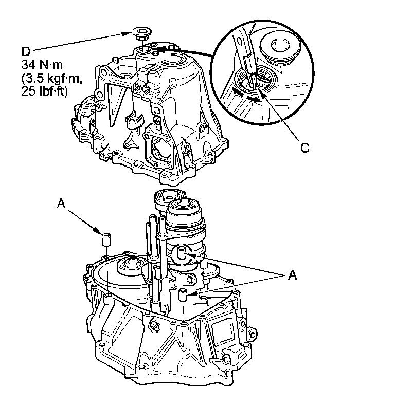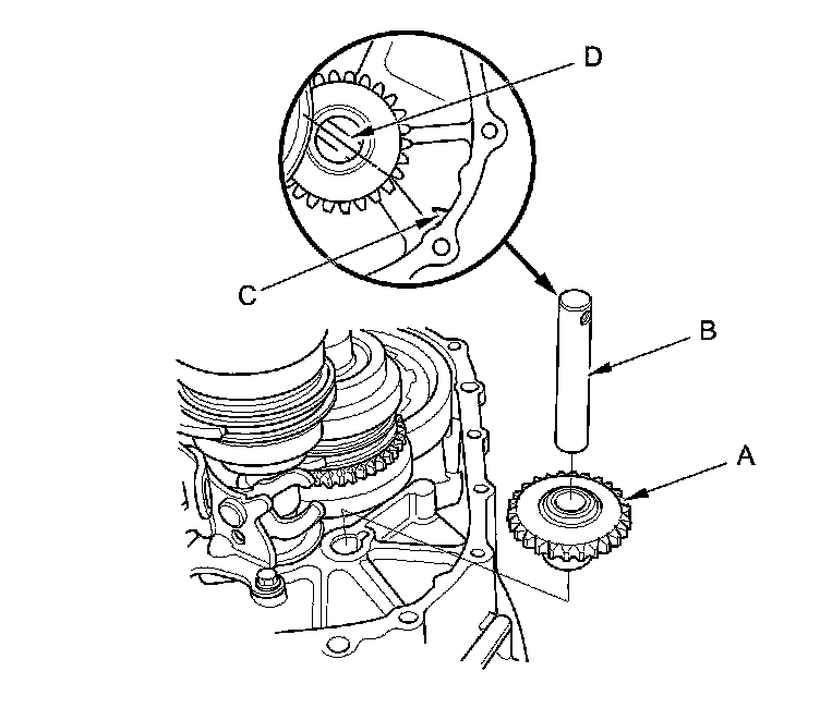 5. Install the reverse idler gear (A) and the reverse idler gear shaft (B) by aligning the mark (C) on the clutch housing with the reverse idler gear shaft hole (D).
