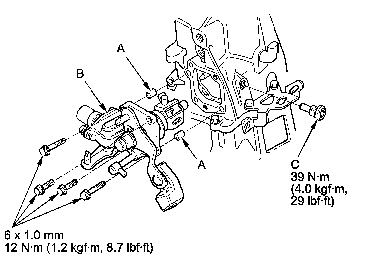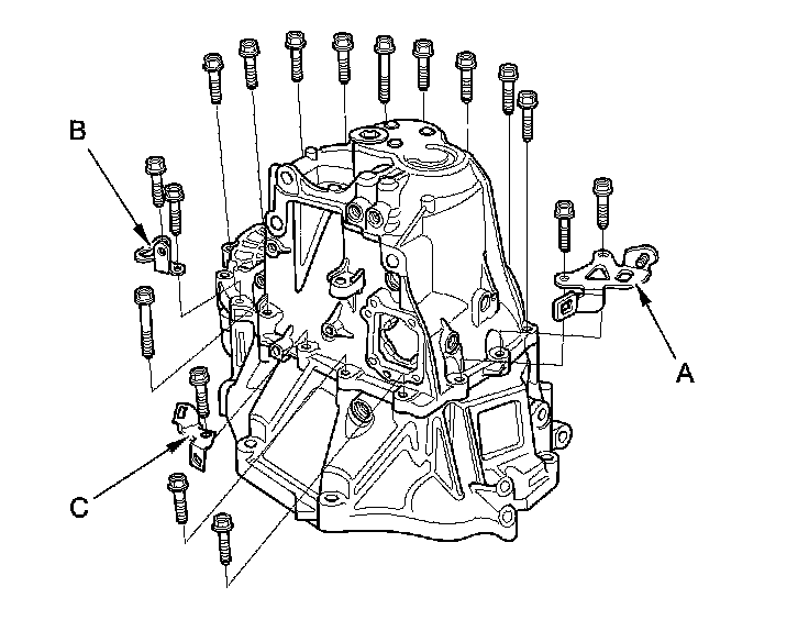 15. Install the 8 mm flange bolts finger-tight with transmission hanger A, transmission hanger B, and the harness bracket (C).