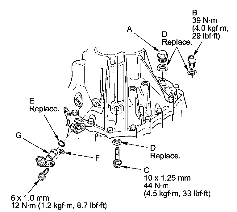 21. Install the filler plug (A) with a new washer finger-tight, and install the drain plug (B) and the 10 mm flange bolt (C) with new sealing washers (D).
