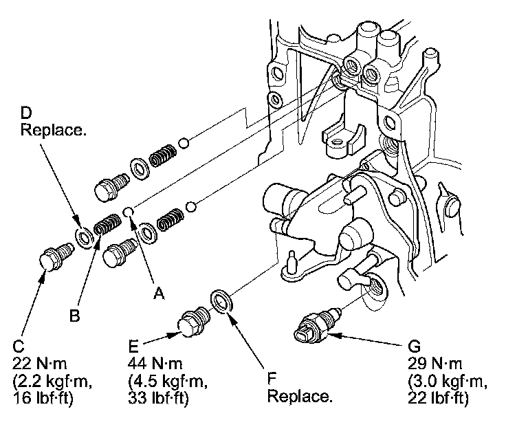 23. Install the steel balls (A), the detent ball springs (B), and the detent bolts (C) with new 12 mm sealing washers (D).