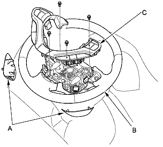 3. Disconnect the connectors from the steering switches, then remove the steering wheel trim (C).