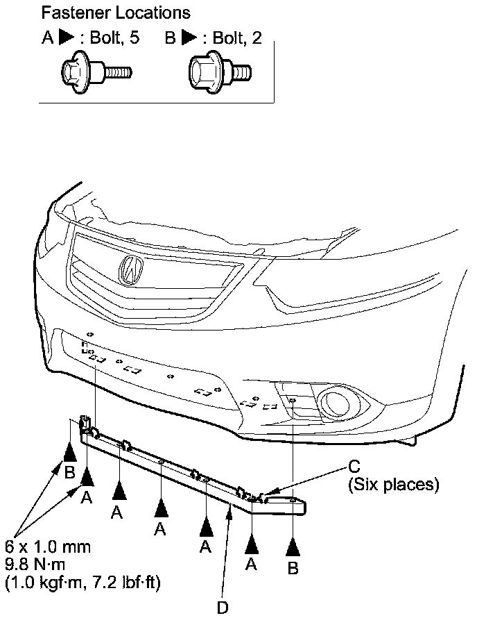 1. Remove the bolts (A, B), and release the hooks (C) (six places), then remove the front bumper air spoiler (D).