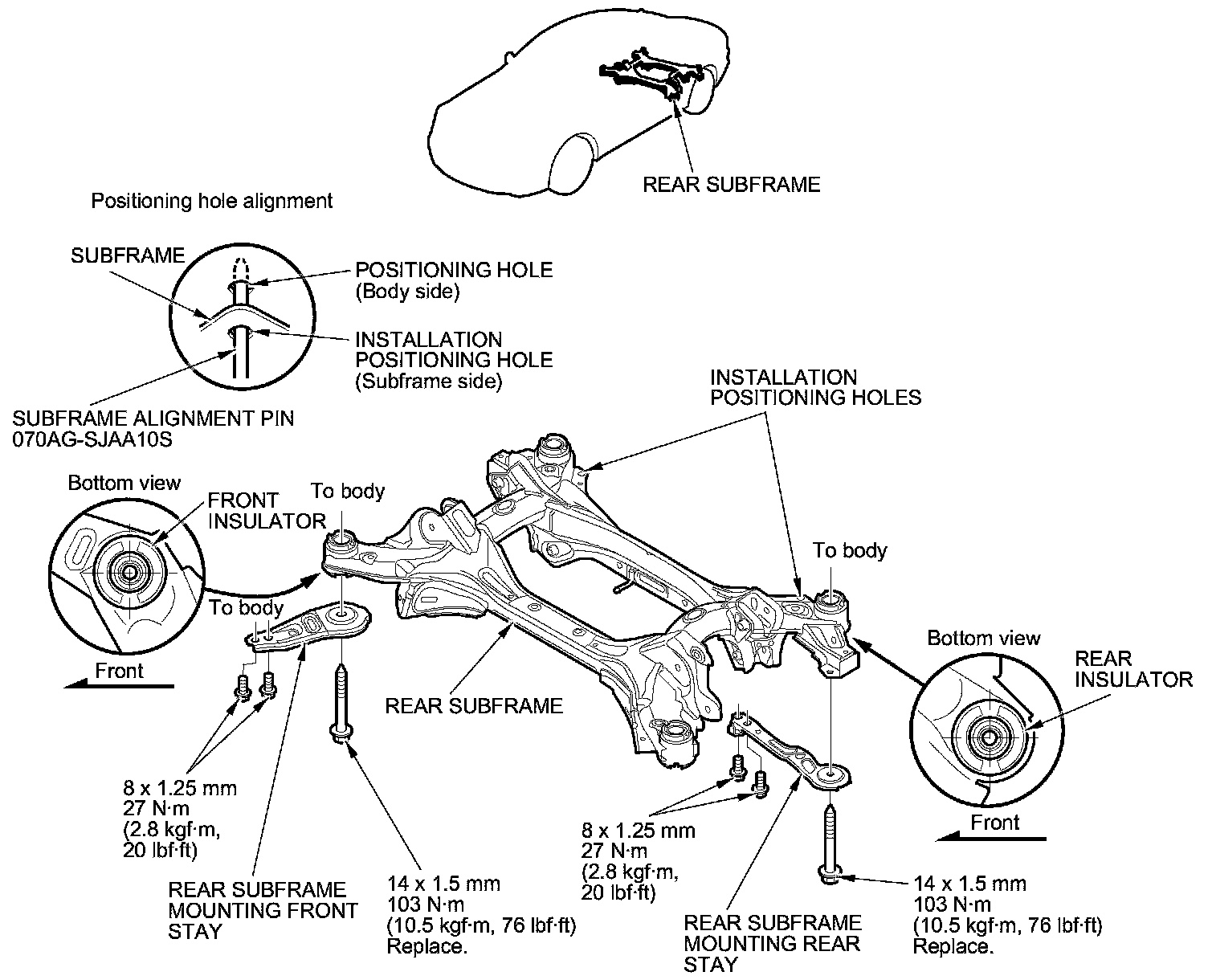 5. Tighten the subframe mounting bolts to the specified torque values starting with the right rear subframe mounting bolt. Use the subframe alignment pin when tightening the rear side subframe mounting bolts.
