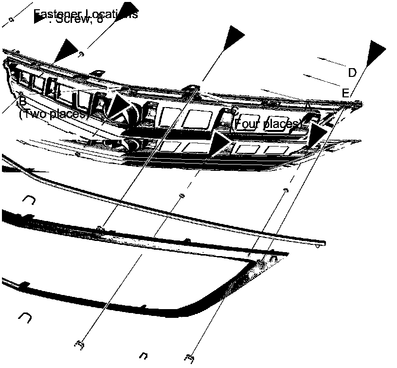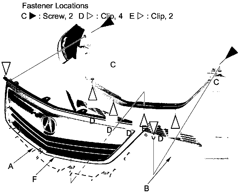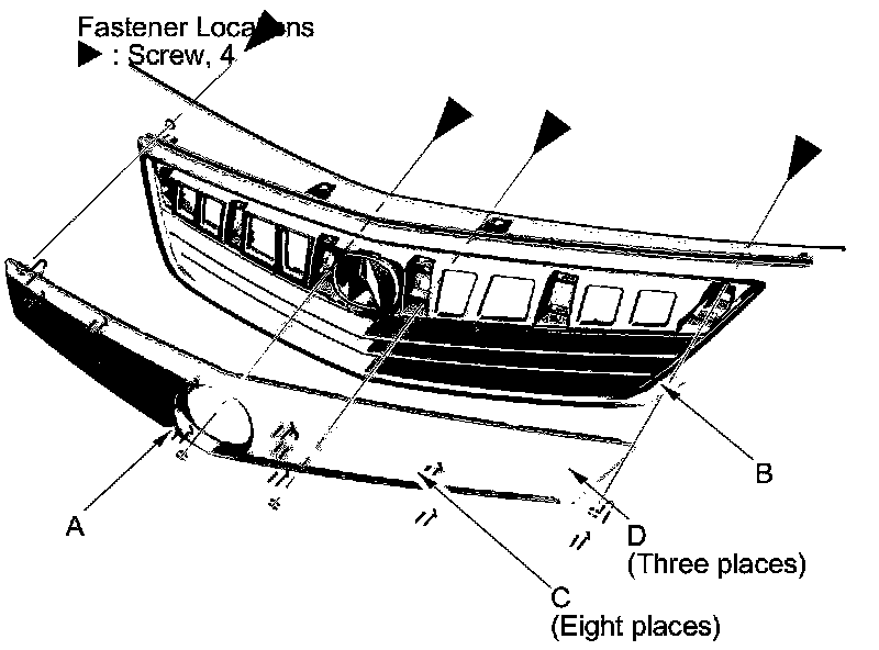 3. Remove the screws, and pull out the front grille molding A to release the hooks (B) (two places) and the hooks (C) (four places) from the front grille base (D), then remove the molding and the center hood seal (E) from the grill base.