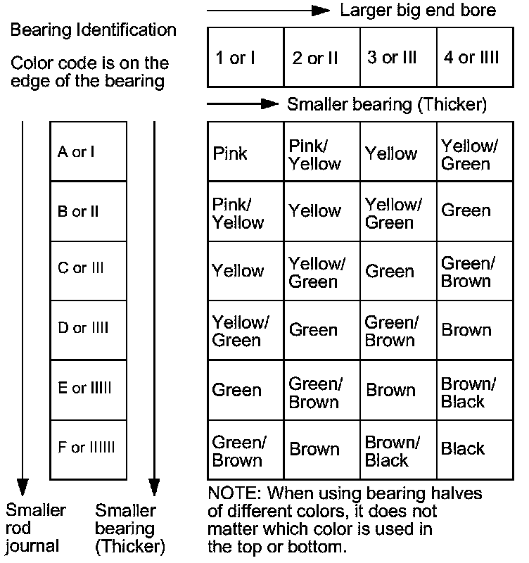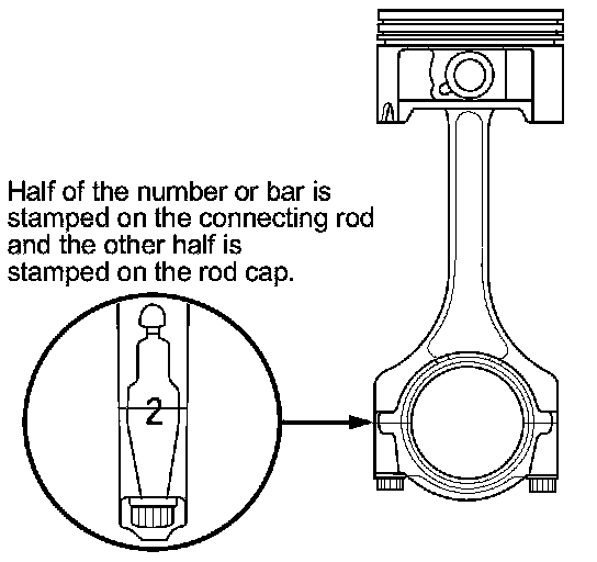 Numbers or bars have been stamped on the side of each connecting rod as a code for the size of the big end. Use them, and the letters or bars stamped on the crank (codes for rod journal size), to choose the correct bearings. If the codes are indecipherable because of an accumulation of dirt and dust, do not scrub them with a wire brush or scraper. Clean them only with solvent or detergent.