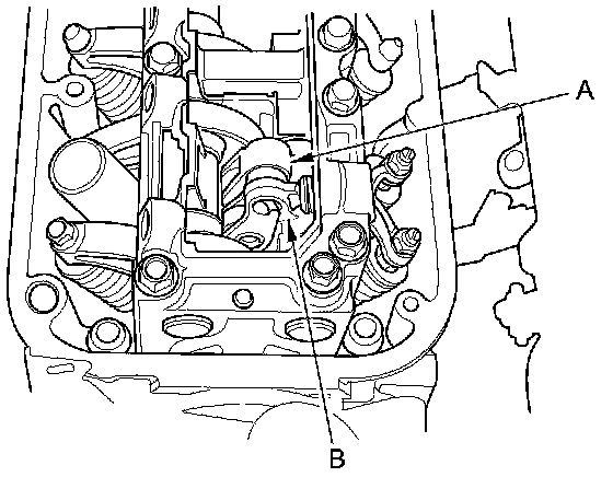 3. Rotate the crankshaft pulley clockwise. Make sure that the intake primary rocker arm (A) and the intake secondary rocker arm (B) are separated and that the intake primary rocker arm should move independently: