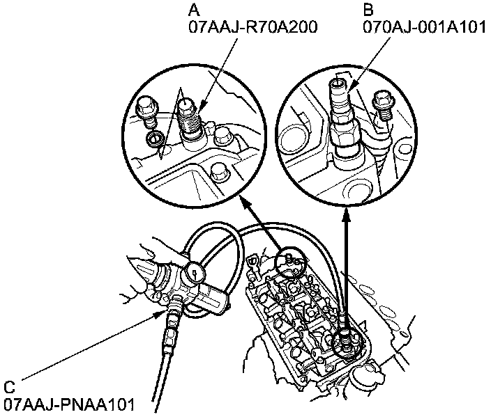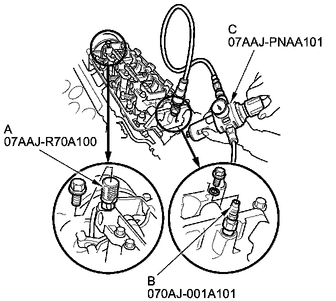 7. Remove the sealing bolts, then install VTEC air stop tool A and the VCM air adapter (B) to the inspection hole, then connect the air pressure regulator (C) as shown.
