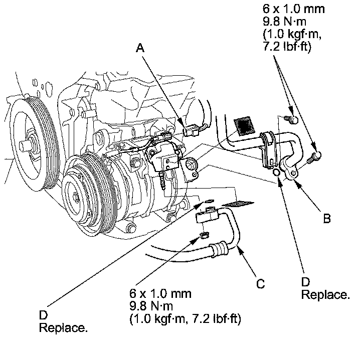 4. Disconnect the A/C compressor clutch connector (A). Remove the bolts and the nut, then disconnect the suction hose (B) and the discharge hose (C) from the A/C compressor. Remove the O-rings (D). Plug or cap the lines immediately after disconnecting them to avoid moisture and dust contamination.