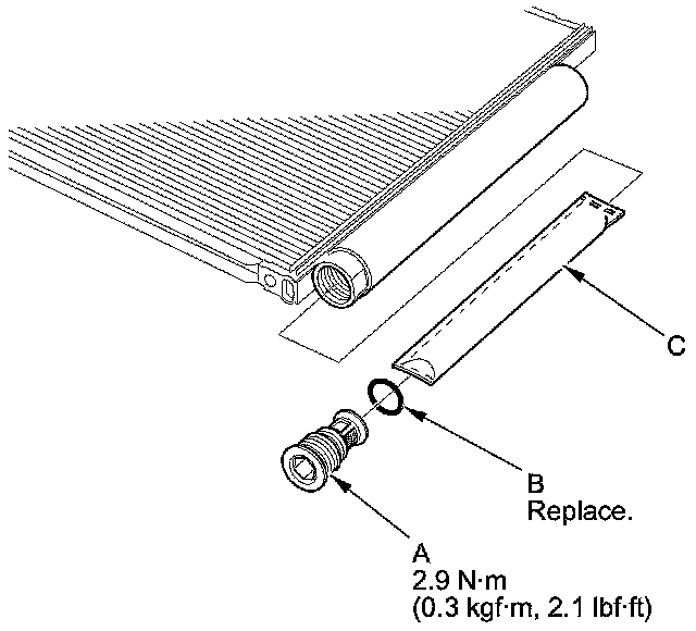 2. Remove the cap (A) from the bottom of the A/C condenser. Remove the O-ring (B) and the desiccant (C).