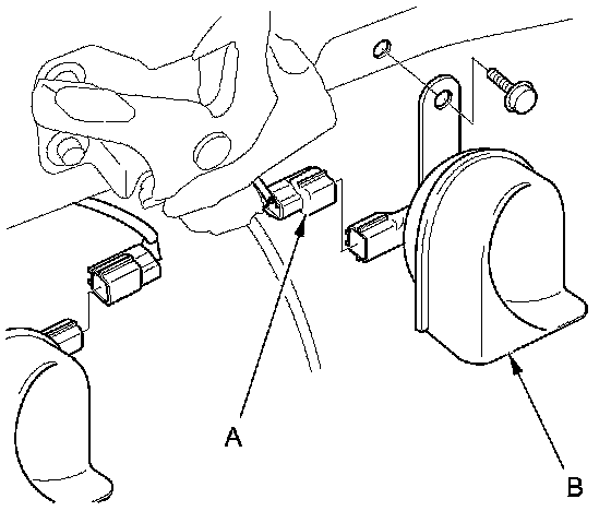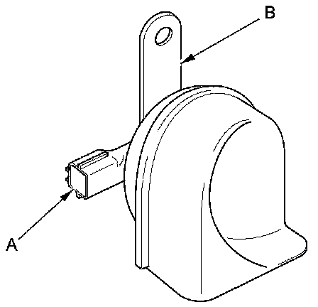 3. Test the horn by momentarily connecting battery power to the terminal (A) and grounding the bracket (B). The horn should sound.
