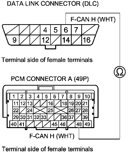 33. Check for continuity between PCM connector terminal A49 and DLC terminal No. 14.