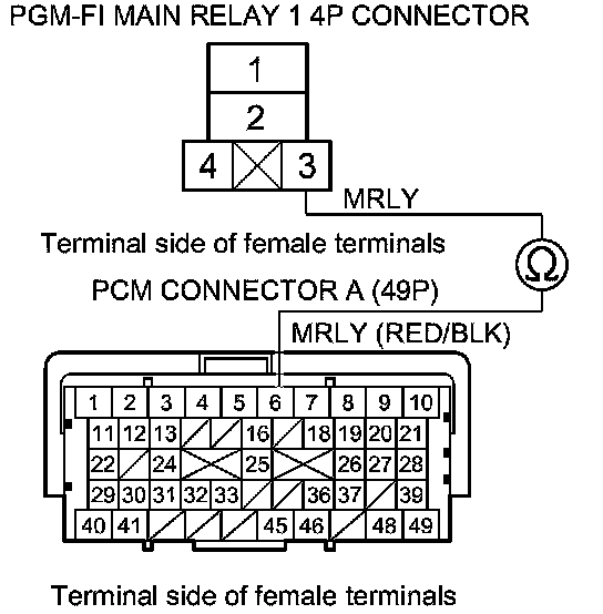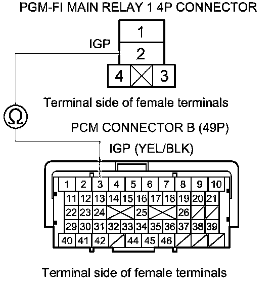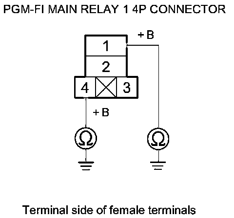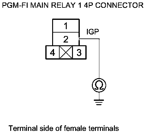 40. Check for continuity between body ground and PGM-FI main relay 1 4P connector terminals No. 1 and No. 4 individually.